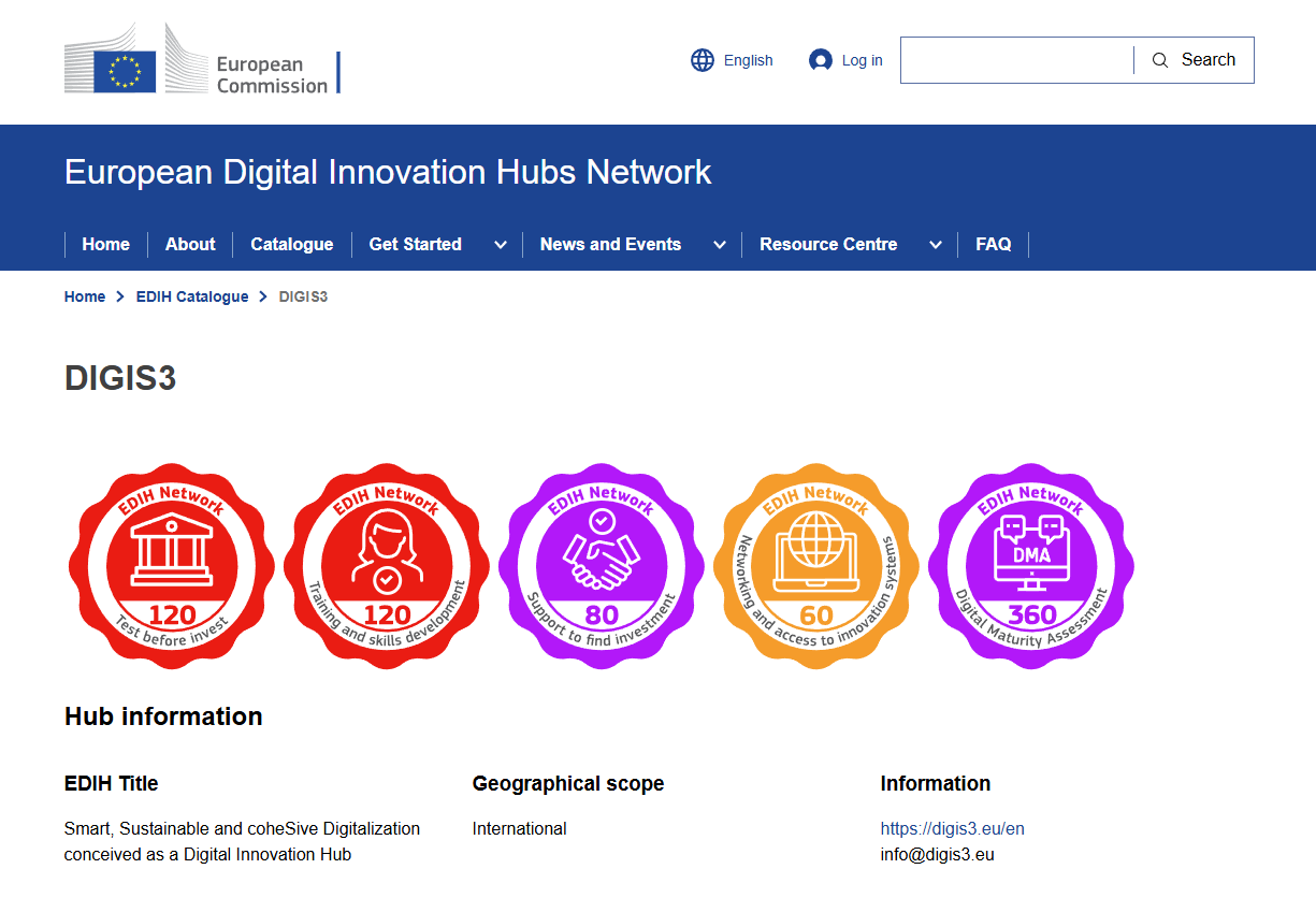 Each badge includes five stages of progression, measuring the level achieved by the respective EDIH. DIGIS3 holds all five badges, with the latest development being a new level achieved in “Networking and access to innovation ecosystems”. As a result, DIGIS3 currently holds the highest level (level 5) in “Support to find investment” and “Digital Maturity Assessment”; level 4 in “Test before invest” and “Training and skills development”; and, as a new achievement, level 3 in “Networking and access to innovation ecosystems”.